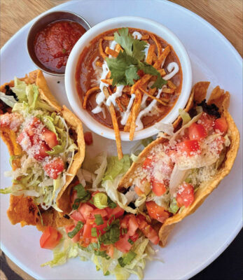 The Shrimp Tacos Dorados dish features two crunchy tacos stuffed with chopped shrimp, diced tomato, onion, red bell pepper, poblano and garlic, all topped with crispy iceberg lettuce and fresh tomato. The tacos are accompanied by a cup of tortilla soup made with tomato, guajillo, ancho chiles and onion, topped with crema, queso fresco, tortilla strips and cilantro. The cost is $21 (plus tax and gratuity). Guests can add a frozen margarita to the mix for $10.