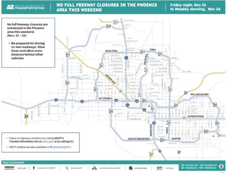 The Arizona Department of Transportation (ADOT) announced that there will be no mainline freeway closures for improvement projects scheduled in the Phoenix area this weekend, Nov. 21-24.