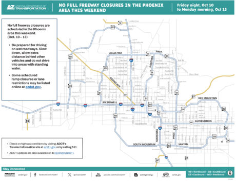 The Arizona Department of Transportation (ADOT) announced that there are no full closures scheduled for freeway improvement projects in the Phoenix area this weekend, Oct. 10-13, but they are asking drivers to slow down on wet roadways, and to allow extra braking distance.