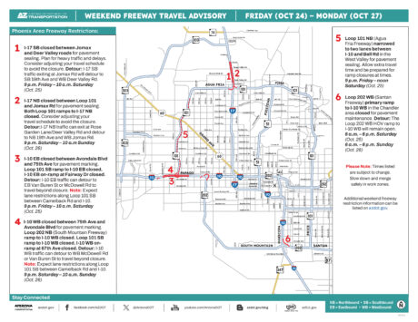 The Arizona Department of Transportation (ADOT) announced that there are several closures to be ready for at times this weekend, Oct. 24-27, especially along I-17 north of Loop 101 in north Phoenix and along I-10 near Loop 101 in the West Valley. Click the Weekend Travel Advisory Map for more information about these improvement project restrictions: