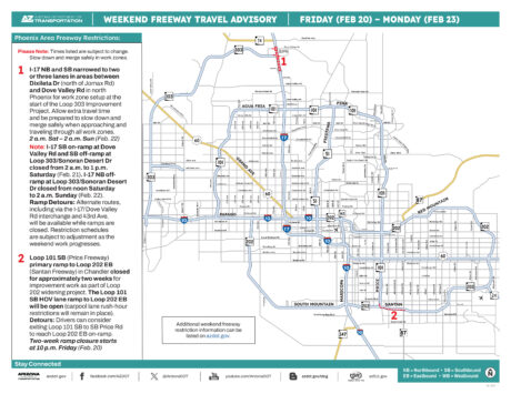 The Arizona Department of Transportation (ADOT) announced lane restrictions and ramp closures scheduled along I-17 near the Loop 303 interchange (south of Carefree Highway) this weekend as its project to widen the 303 west of I-17 gets started (this project also will build direct freeway-to-freeway ramps between the two freeways). In addition, there will be a two-week closure of one of the ramps at the 101/202 interchange in Chandler, which starts Friday night (Feb. 20). Click the Weekend Travel Advisory Map for more information about this improvement work: