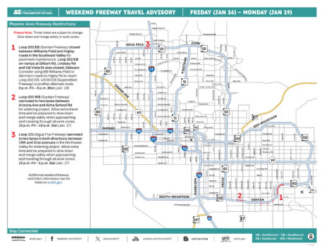 • Loop 101 (Agua Fria Freeway) narrowed to two lanes in both directions between 19th and 31st avenues in the Northwest Valley from 10 p.m. Friday to 5 p.m. Saturday (Jan. 17) for widening project. Allow extra travel time and be prepared to slow down and merge safely when approaching and traveling through all work zones.