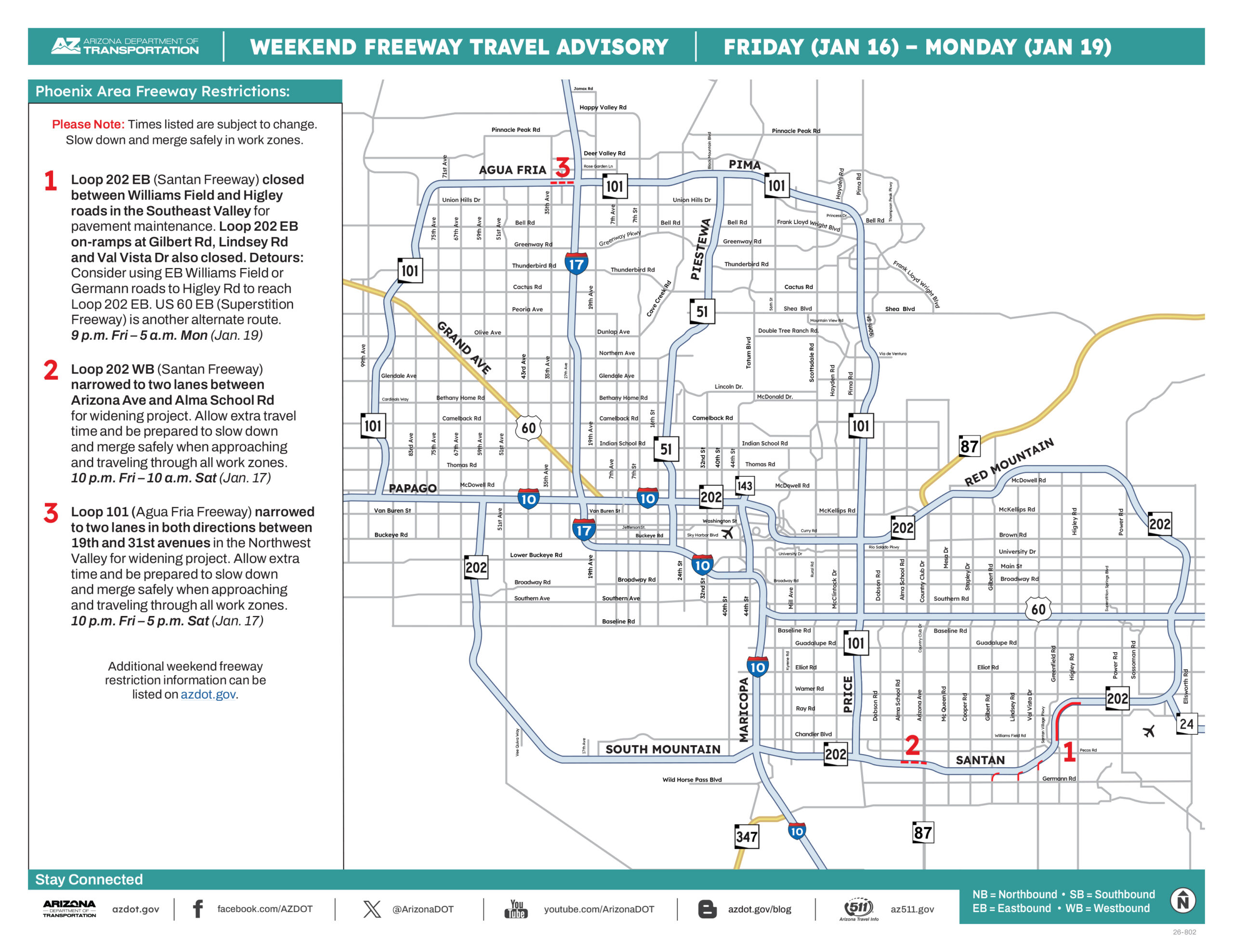 • Westbound Loop 202 (Santan Freeway) narrowed to two lanes between Arizona Avenue and Alma School Road in Chandler from 10 p.m. Friday to 10 a.m. Saturday (Jan. 17) for widening project. Allow extra travel time and be prepared to slow down and merge safely when approaching and traveling through all work zones.